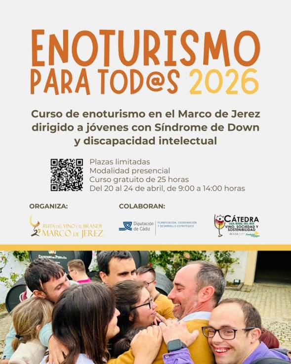 La Ruta del Vino y el Brandy del Marco de Jerez, en colaboración con la Diputación de Cádiz y la Universidad de Cádiz, ha puesto en marcha la tercera edición de “Enoturismo para tod@s”. Este curso, pionero en el sector, está diseñado específicamente para jóvenes con Síndrome de Down y discapacidad intelectual, consolidándose como un referente nacional tras haber recibido reconocimientos de prestigio como la Mención Especial en los Premios de Enoturismo de Rutas del Vino de España.