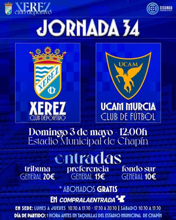 El Xerez Club Deportivo encara la recta final de la temporada en la Segunda Federación y ya tiene la mirada puesta en la Jornada 34. El próximo domingo 3 de mayo, el Estadio Municipal de Chapín vestirá sus mejores galas para recibir al UCAM Murcia CF en un encuentro que promete emociones fuertes. Con el objetivo de asegurar un ambiente de gala, la entidad xerecista ha lanzado la campaña de venta de entradas para este duelo crucial que arrancará a las 12:00 horas.